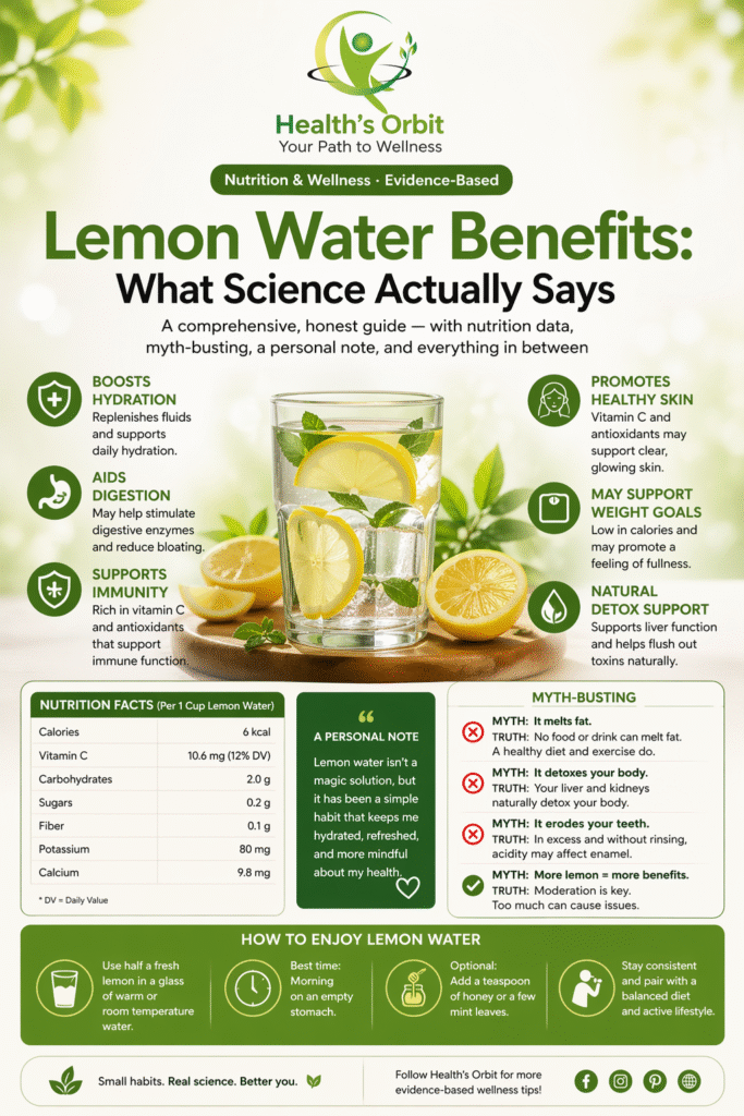 The answer sits somewhere in between, and that’s exactly what makes it worth exploring properly. Lemon water is simply water infused with fresh lemon juice, lemon slices, or both. It is low in calories, naturally flavored, and easy to make. When prepared with fresh lemon rather than bottled juice, it delivers a meaningful dose of vitamin C, antioxidants, and plant compounds that offer documented health value  though perhaps not the miraculous effects often claimed. This article walks through every major lemon water benefit backed by research, compares it honestly with plain water, busts the most common myths, and gives you a practical daily routine to follow.